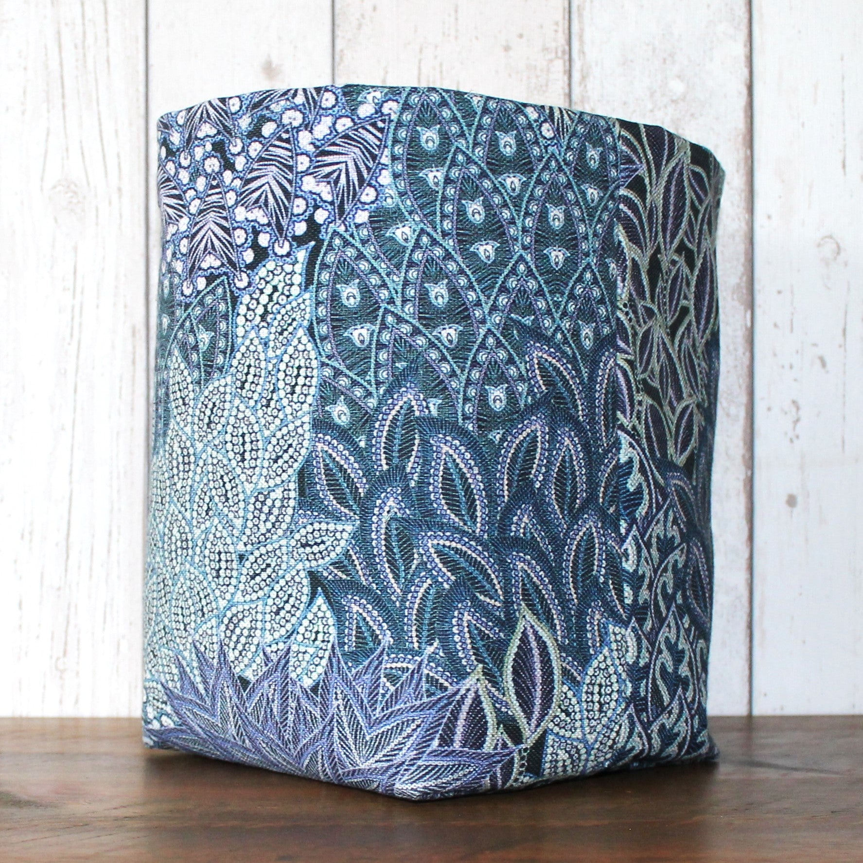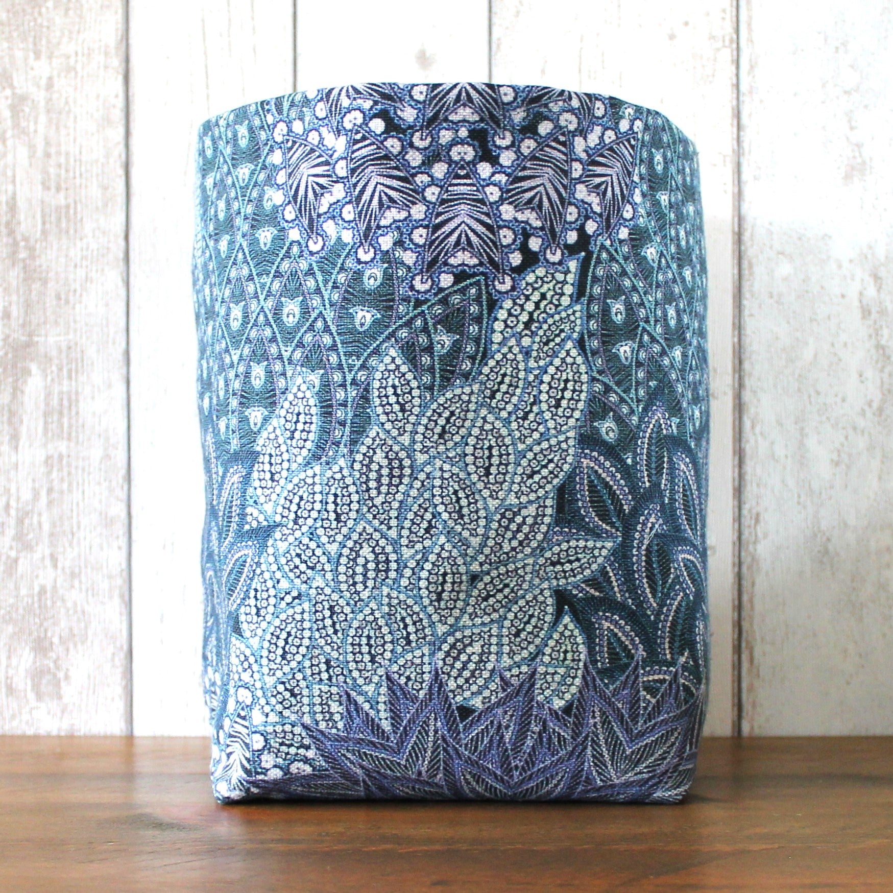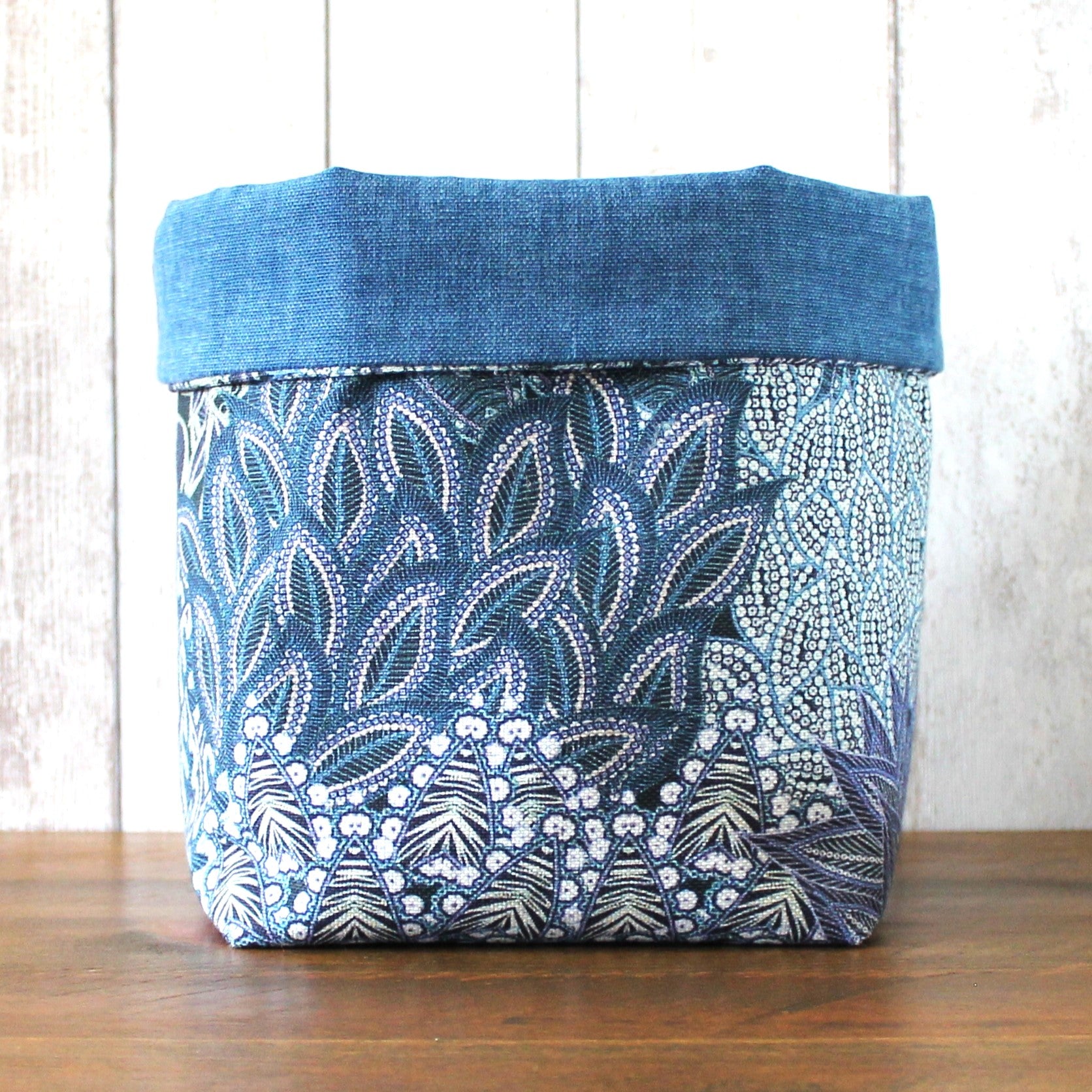 A fabric storage bin with a striking batik style print outer fabric in shades of blue. The storage bin is lined in a denim blue soft touch fabric.