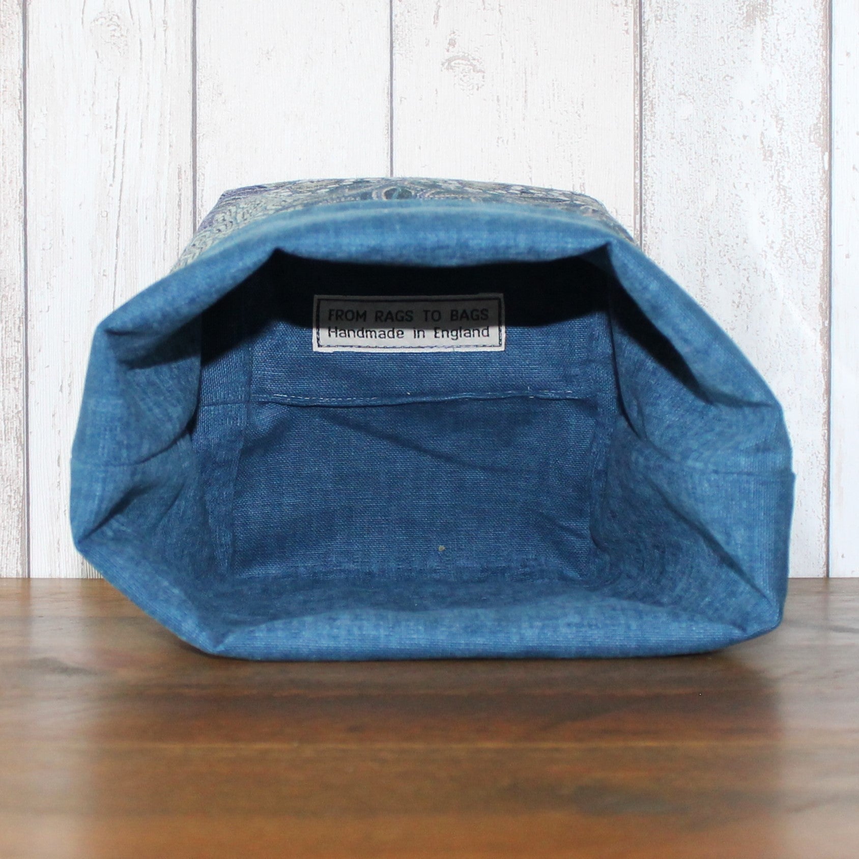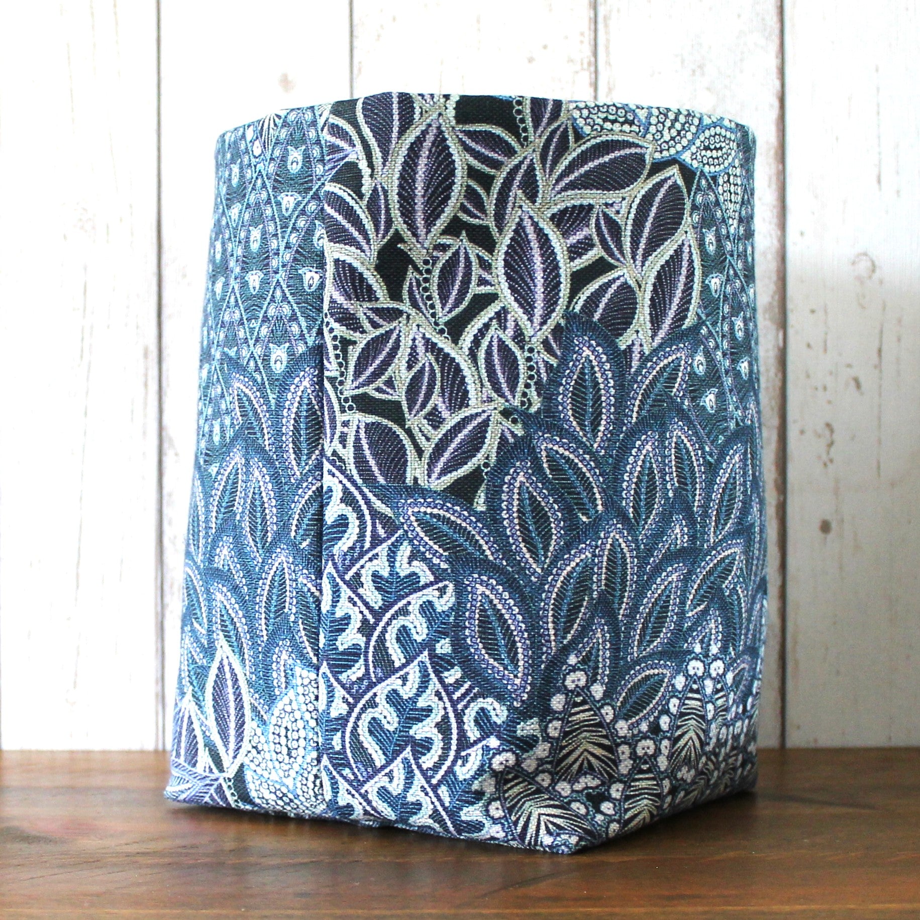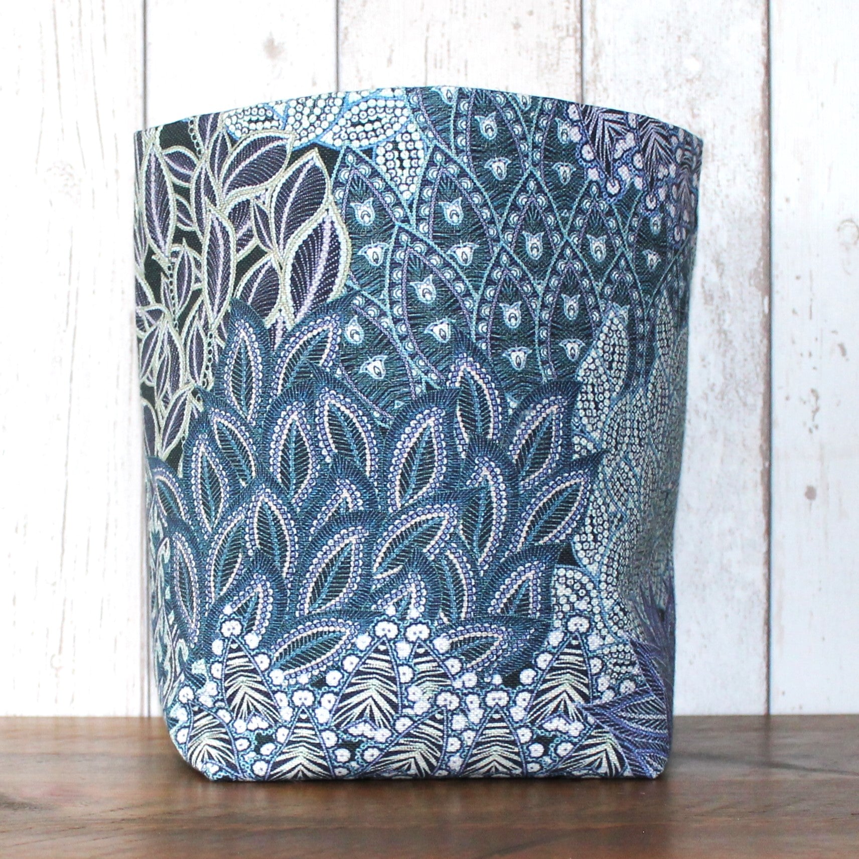 A fabric storage bin with a striking batik style print outer fabric in shades of blue. The storage bin is lined in a denim blue soft touch fabric.