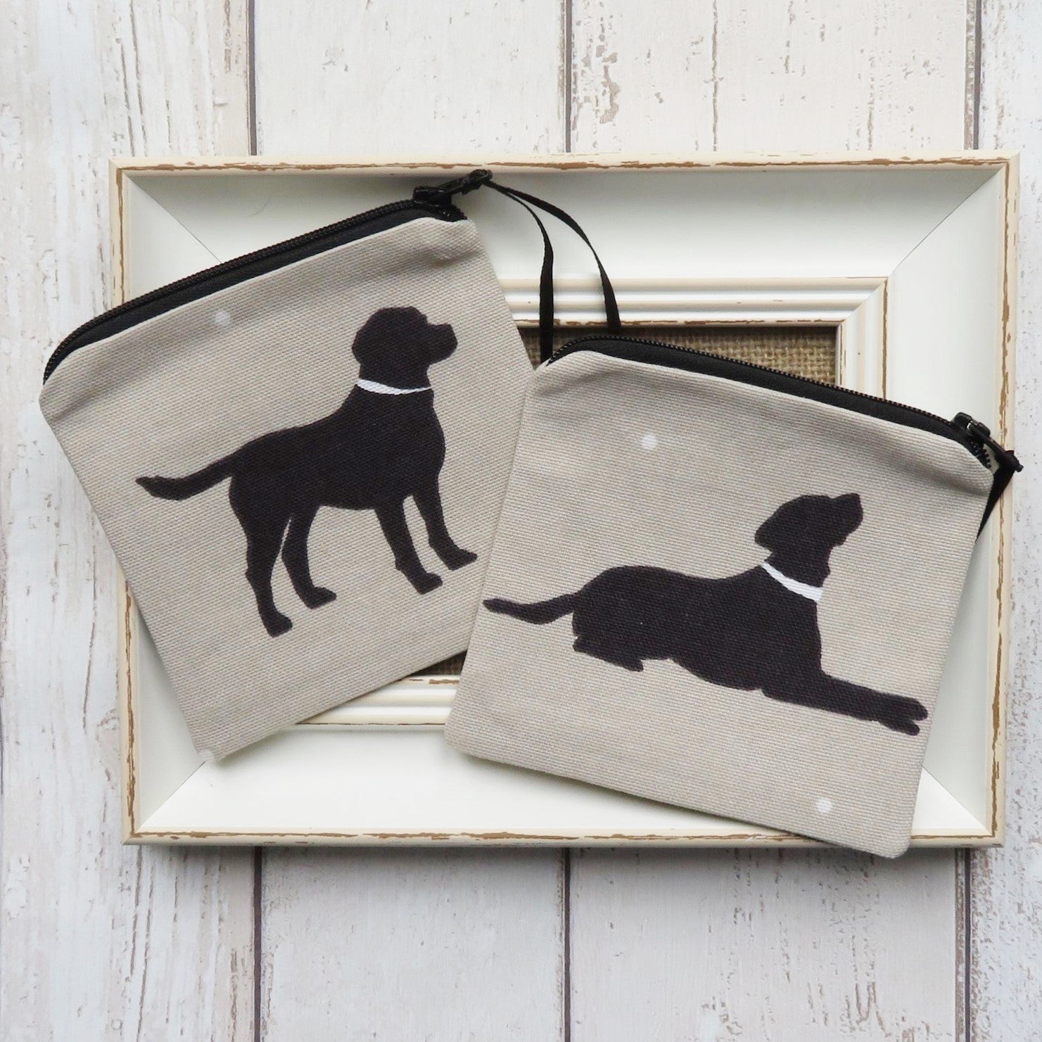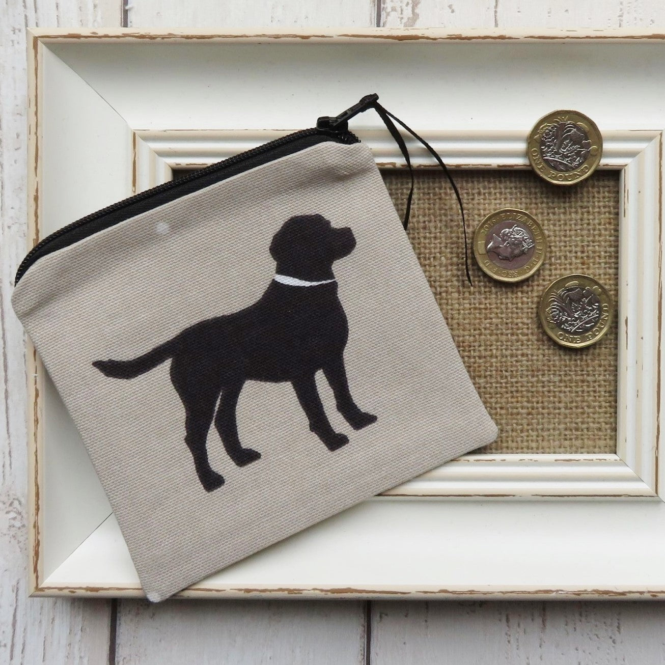 A fabric coin purse with a black labrador design on both sides. The top has a zip with a ribbon to make it easier to open and the inside is lined in a coordinating cotton fabric.