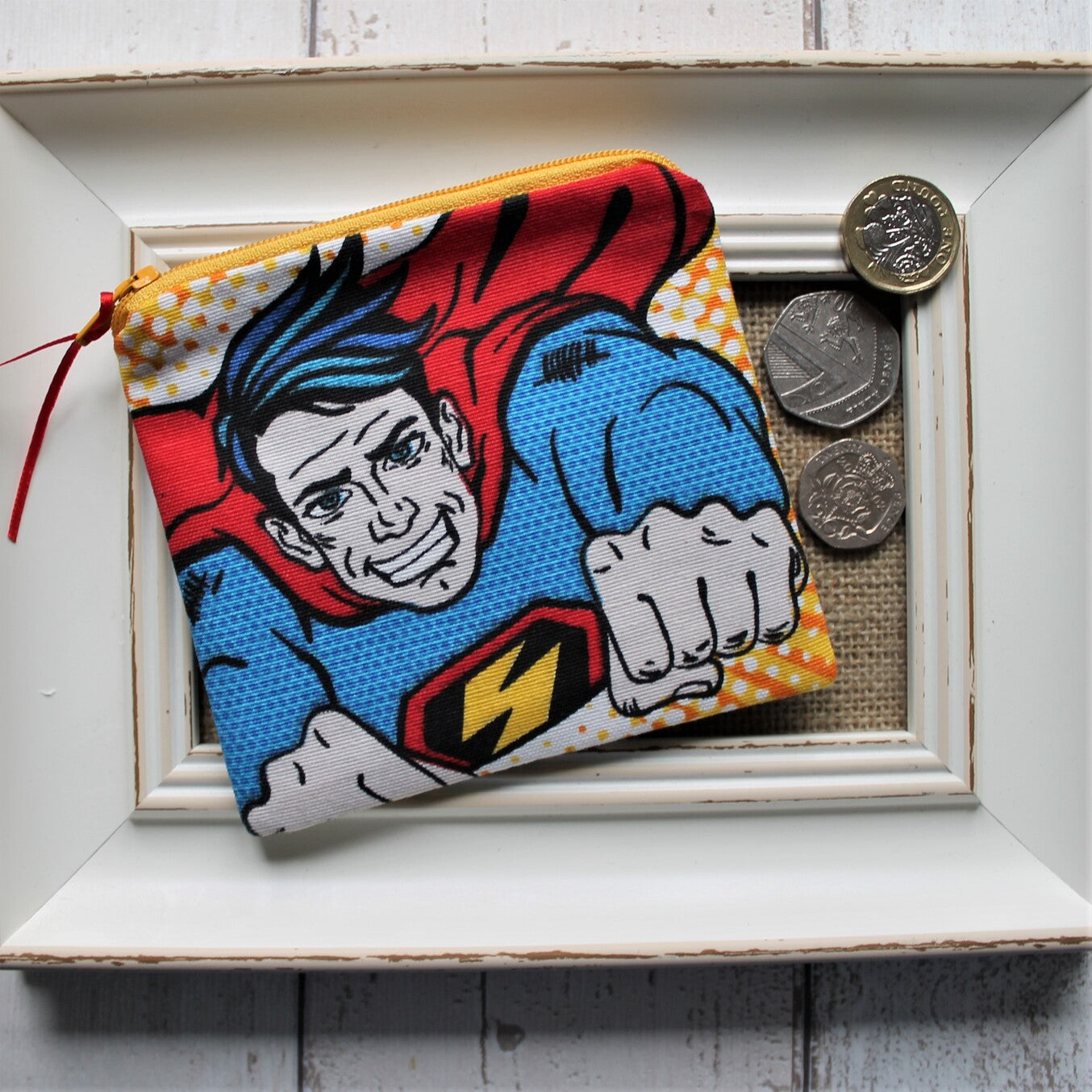 A fabric coin purse with a comic book design on both sides. The top has a zip with a ribbon to make it easier to open and the inside is lined in a coordinating cotton fabric. The designs available of superhero, woman and hand with a word on the reverse.