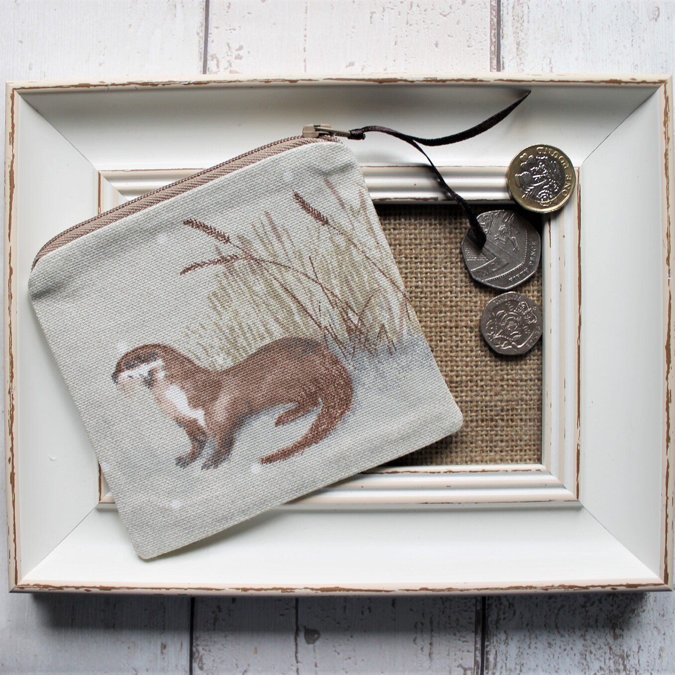 A fabric coin purse with an otter design on both sides. The top has a zip with a ribbon to make it easier to open and the inside is lined in a coordinating cotton fabric.