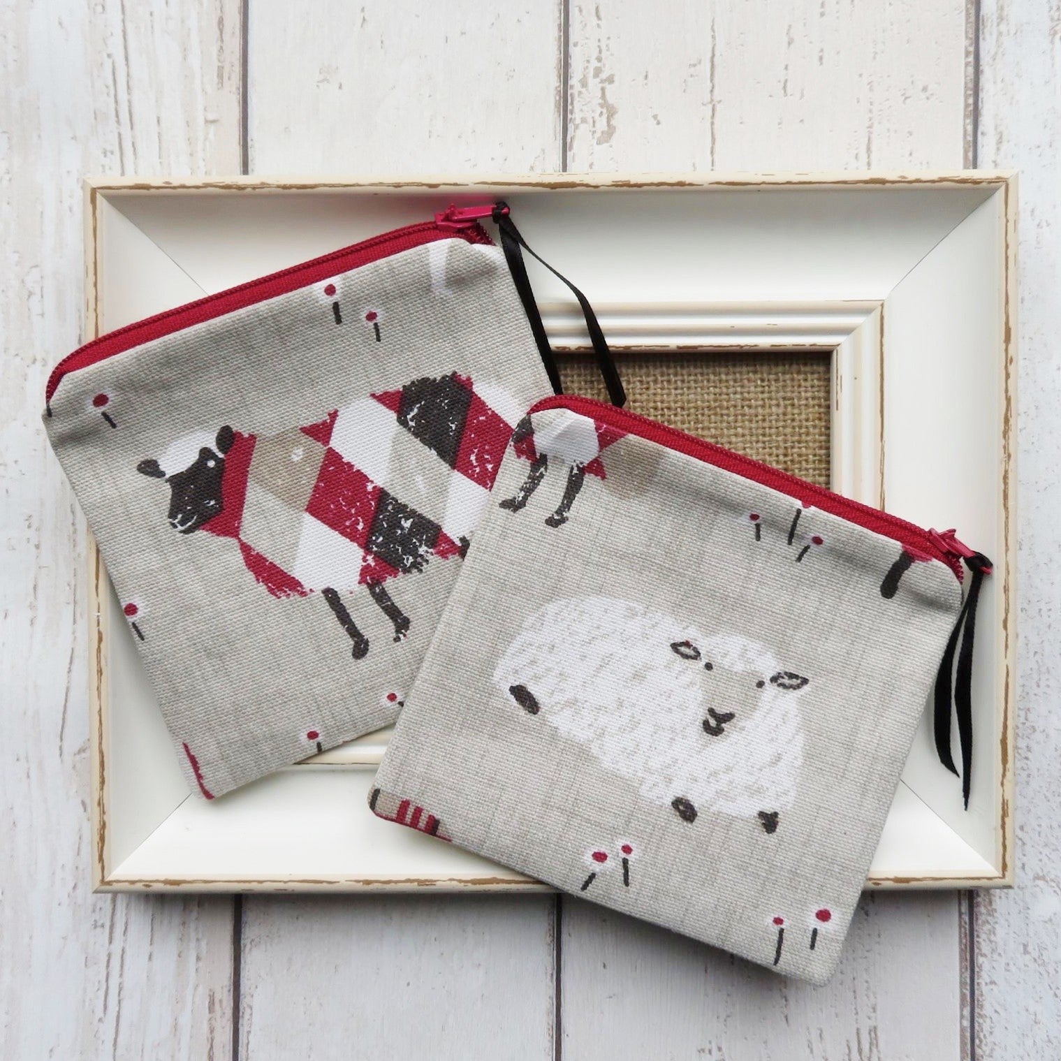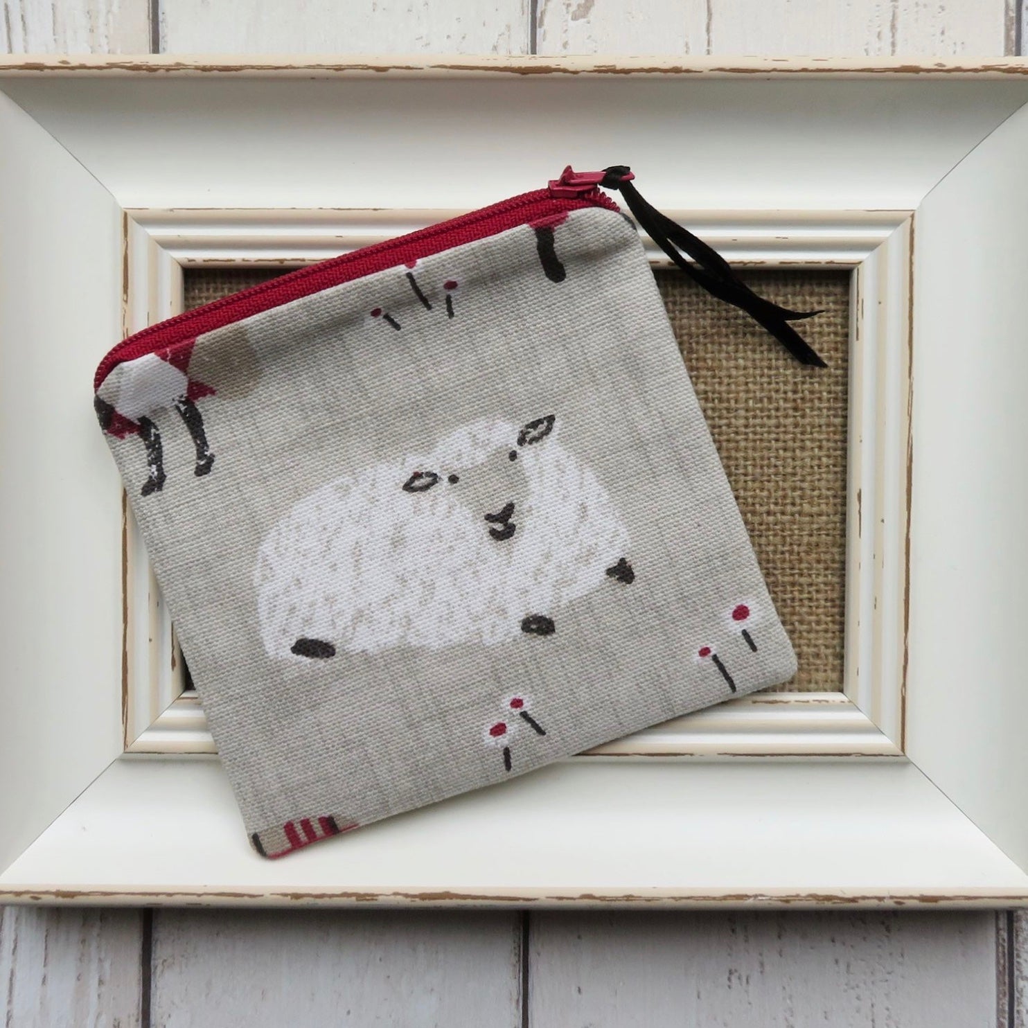 A fabric coin purse with a sheep design on both sides. The top has a zip with a ribbon to make it easier to open and the inside is lined in a coordinating cotton fabric.