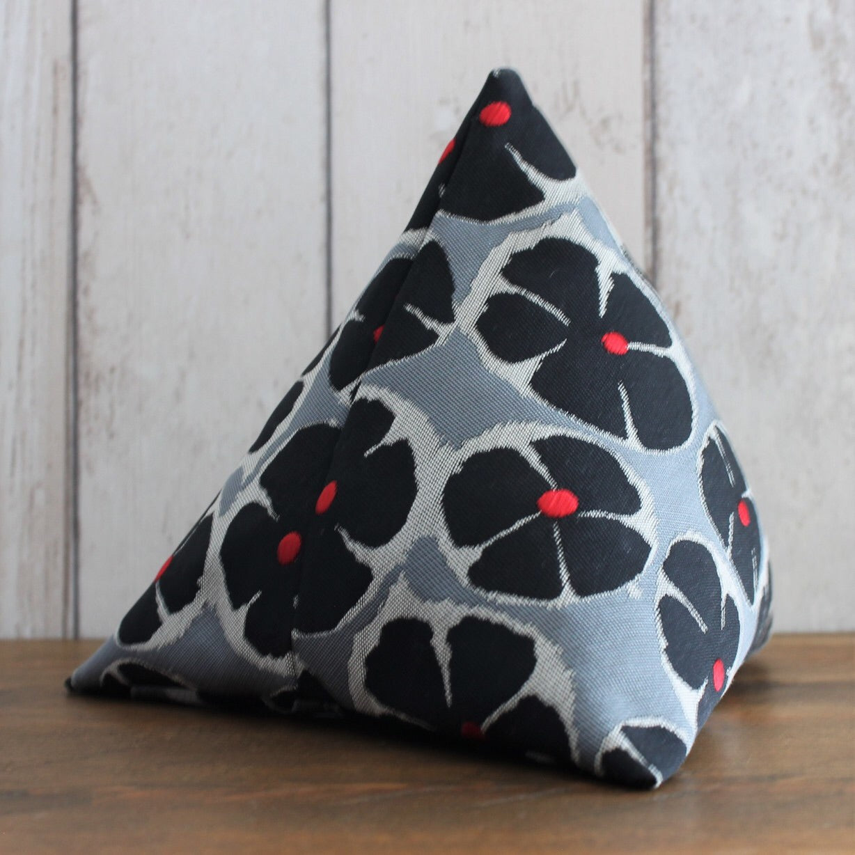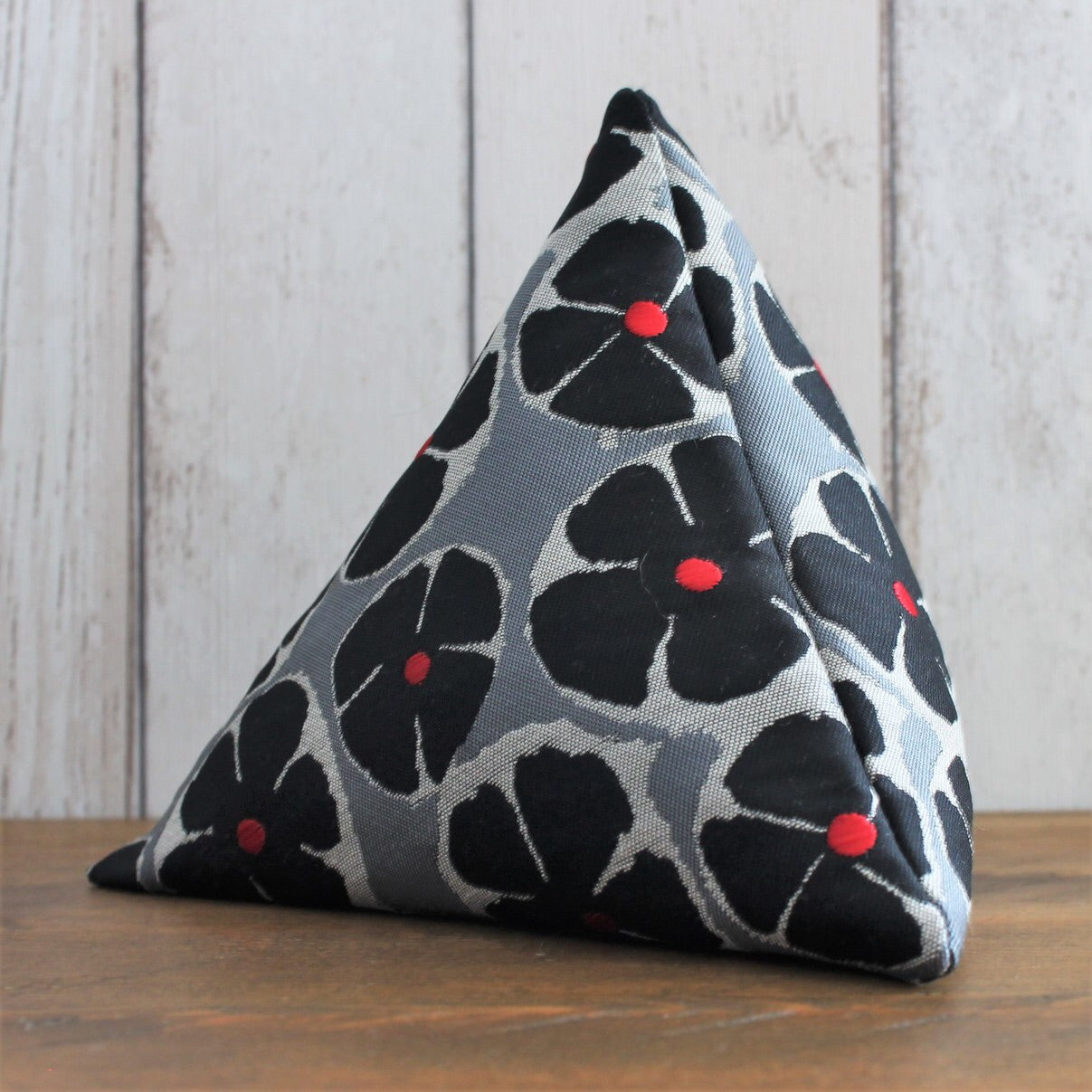 A fabric doorstop pyramid made from a black, silver grey and red furnishing fabric in a floral pattern. Doorstops are approximately 19cm along each side.