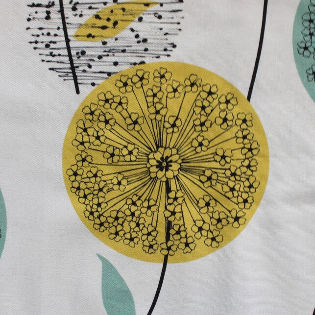 A large laundry bag with an abstract dandelion clock print in yellow, green and grey on a cream background. The top of the laundry bag has a drawstring. Approximately 58cm wide and 61cm long making it quite spacious for your laundry.