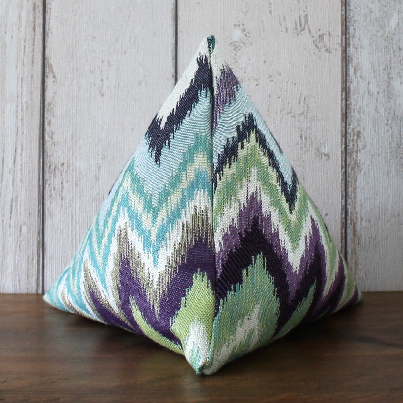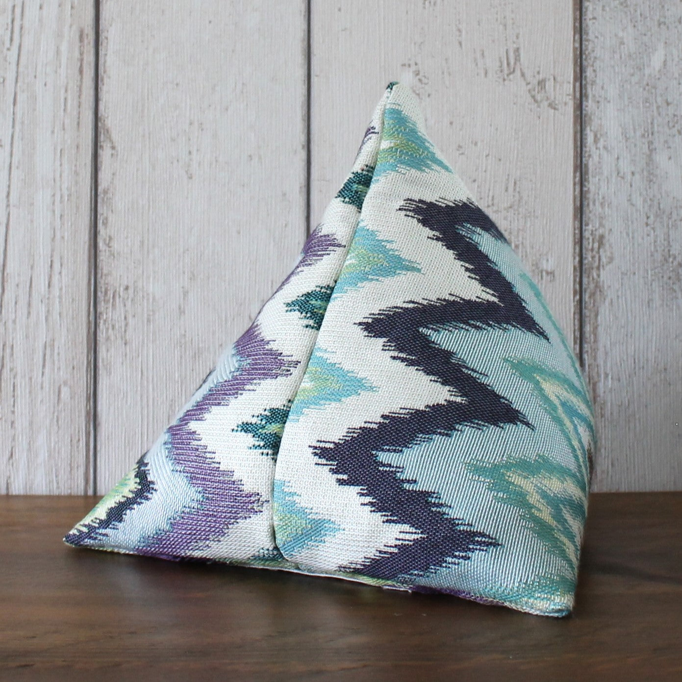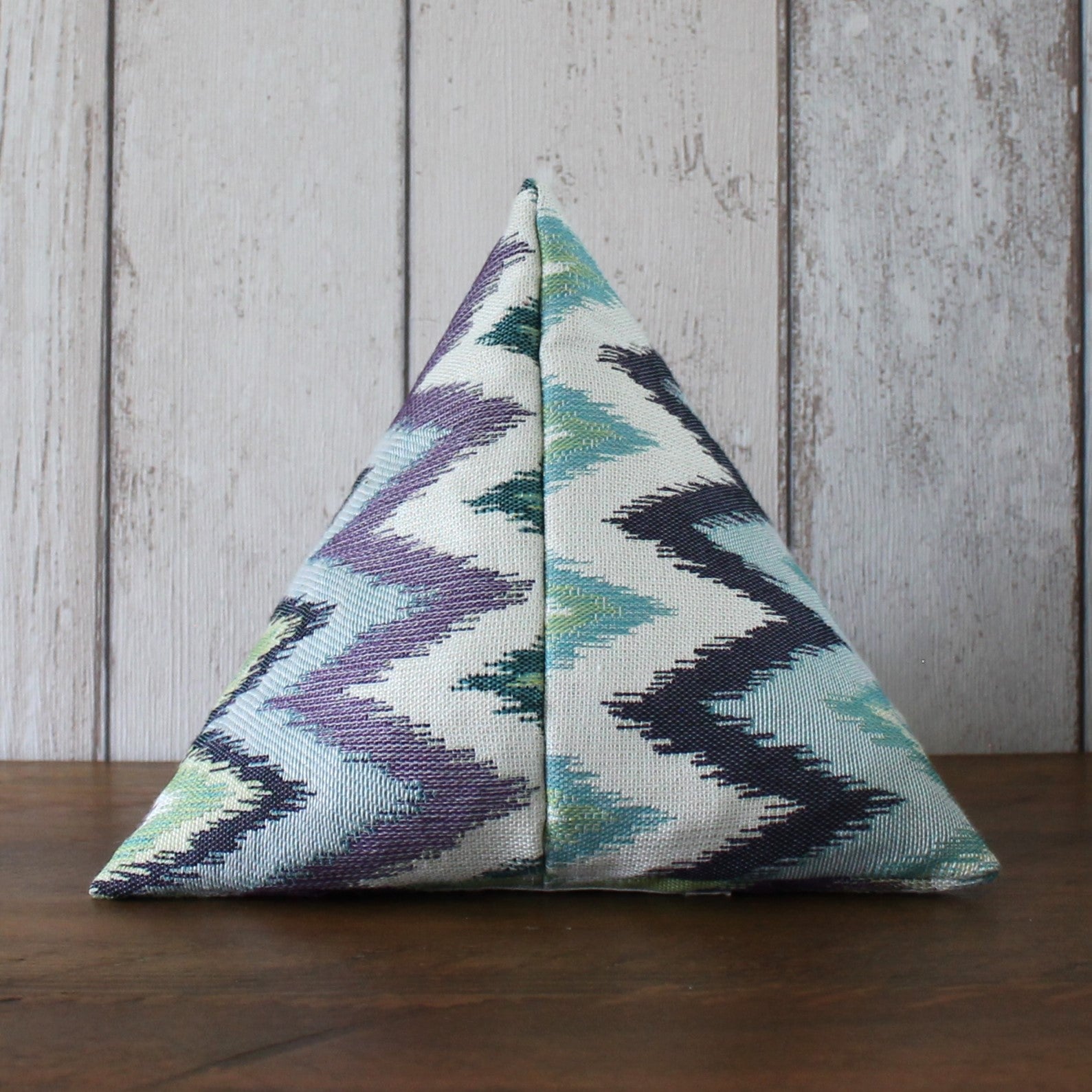 A fabric doorstop pyramid made from a furnishing fabric with a blue, green and purple zigzag pattern. Doorstops are approximately 19cm along each side.
