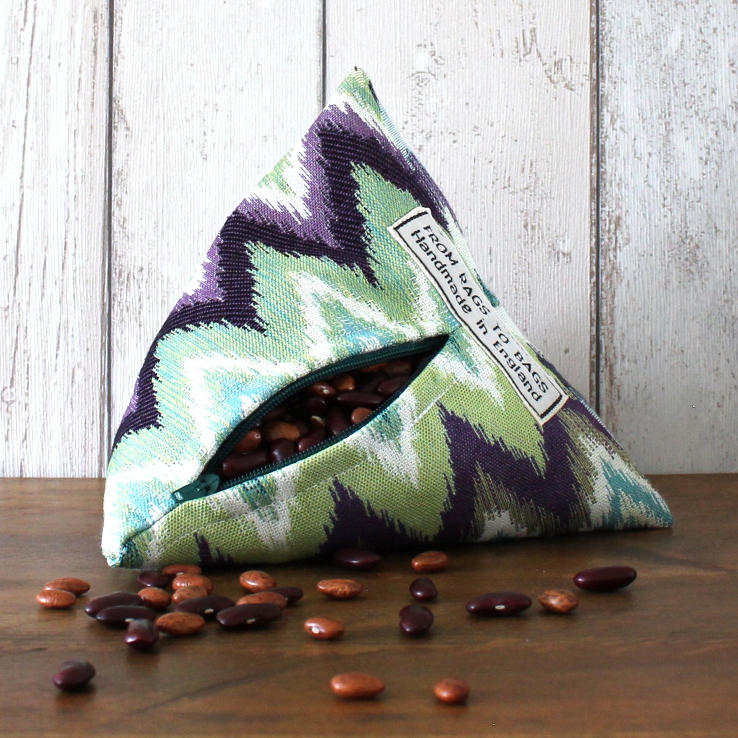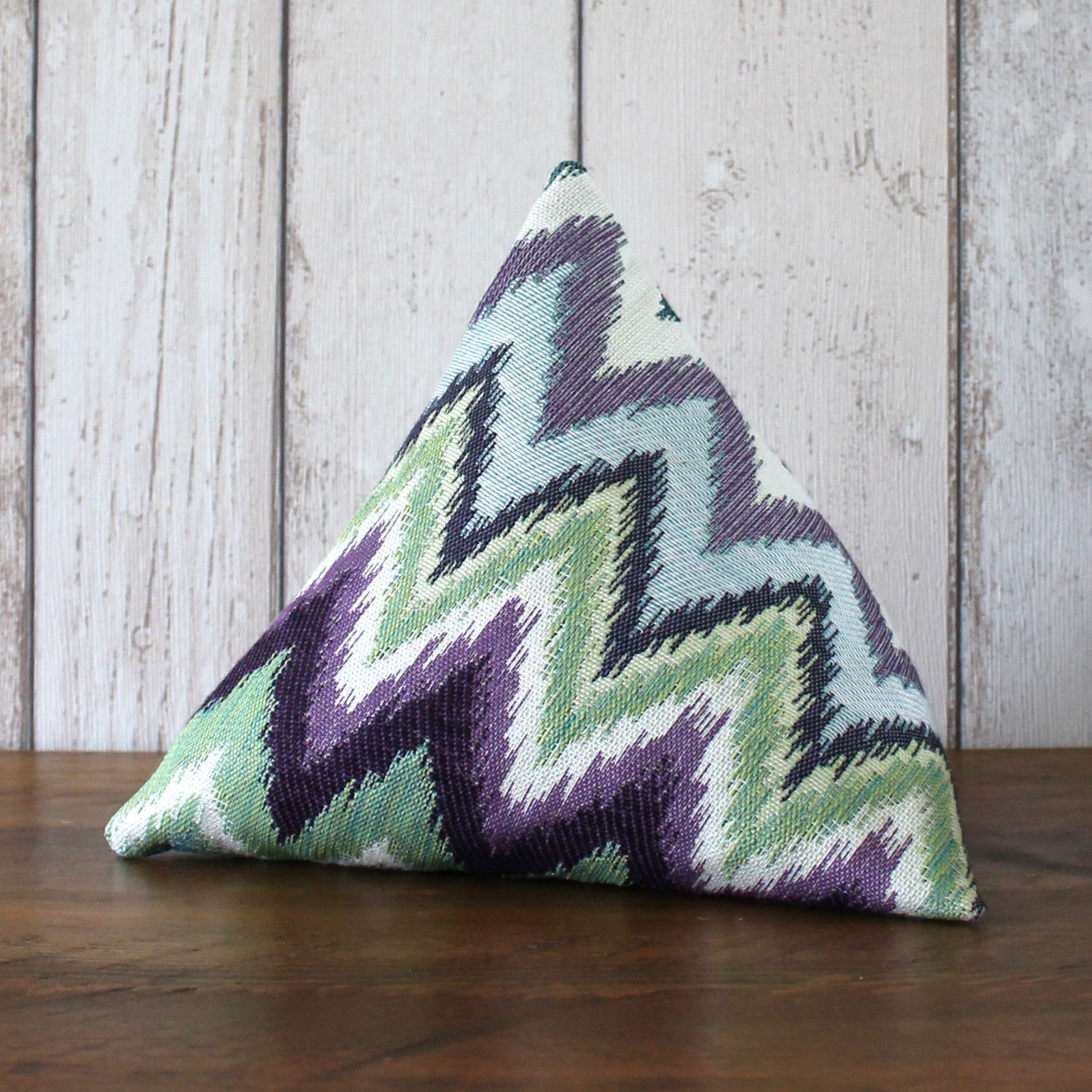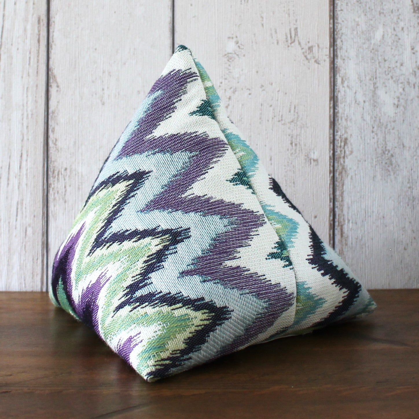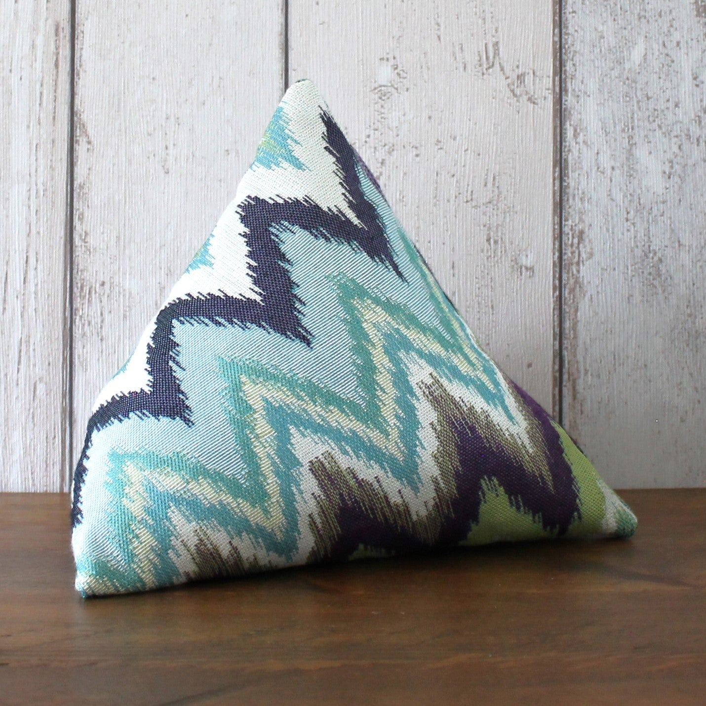 A fabric doorstop pyramid made from a furnishing fabric with a blue, green and purple zigzag pattern. Doorstops are approximately 19cm along each side.