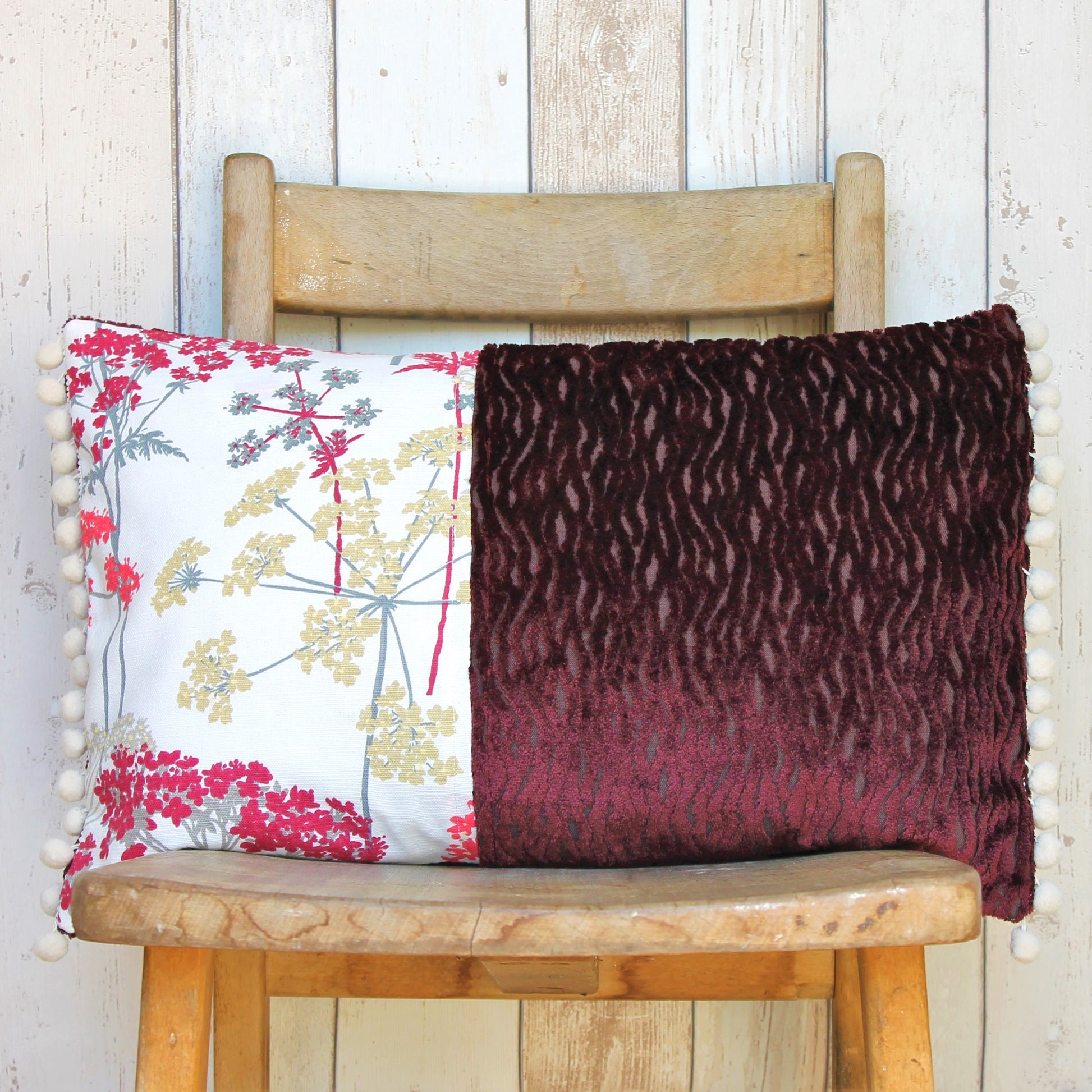A rectangular cushion made from two cotton furnishing fabrics. The front features a cow parsley print in reds, grey and beige on cream to one side and a wine red, soft, wavy chenille fabric to the other. The wine red chenille is also used on the reverse. The side edges also feature cream pom pom trim.