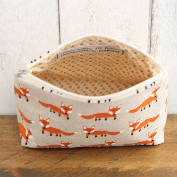 A fox print fabric zipped makeup bag which is perfect for makeup and gadgets. Ideal for keeping in your bag or taking on holiday.