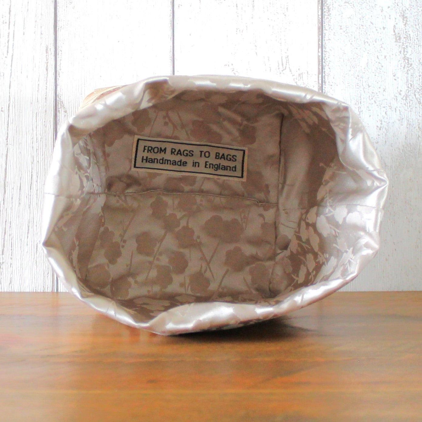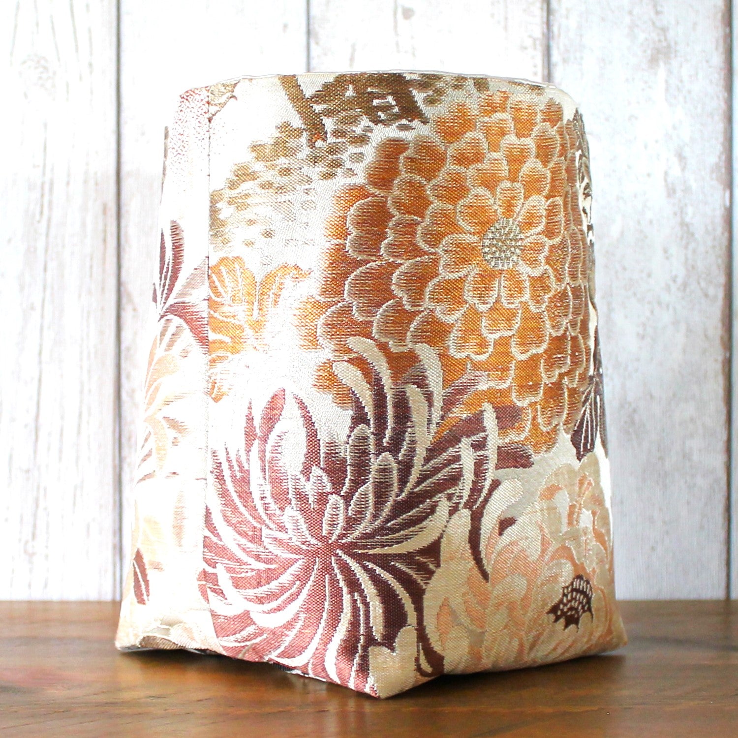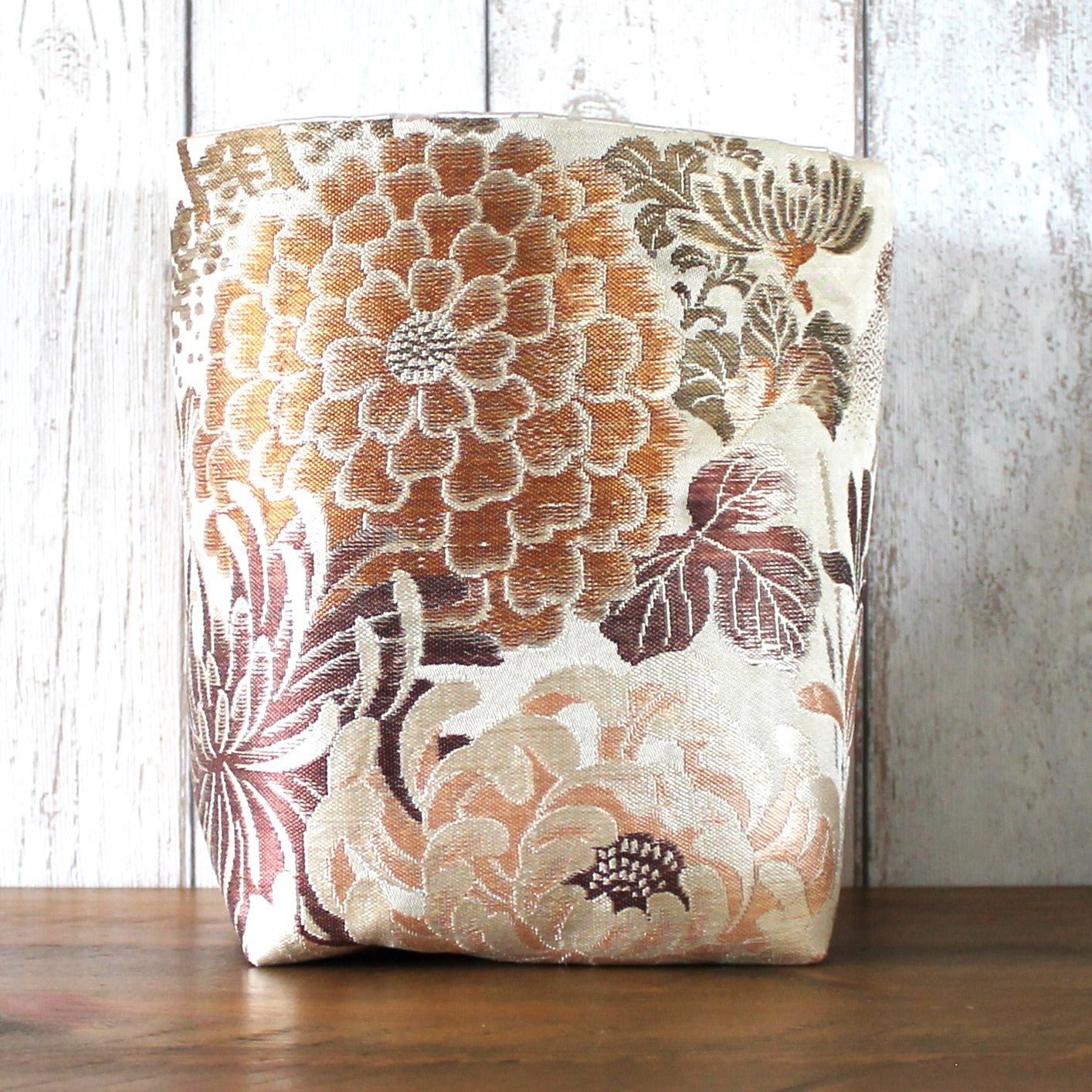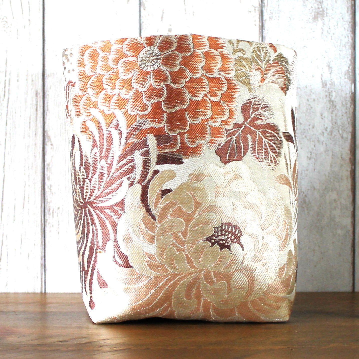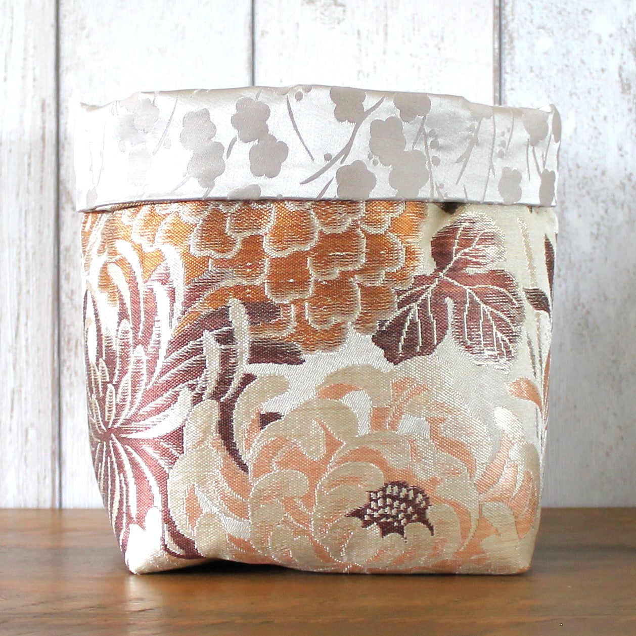 A one off design fabric storage bin with a Japanese floral print fabric outer fabric in shades of brown, beige and copper. The outer fabric was reclaimed from a traditional Japanese obi belt. The bin is lined with a taupe satin fabric embossed with blossom flowers.
