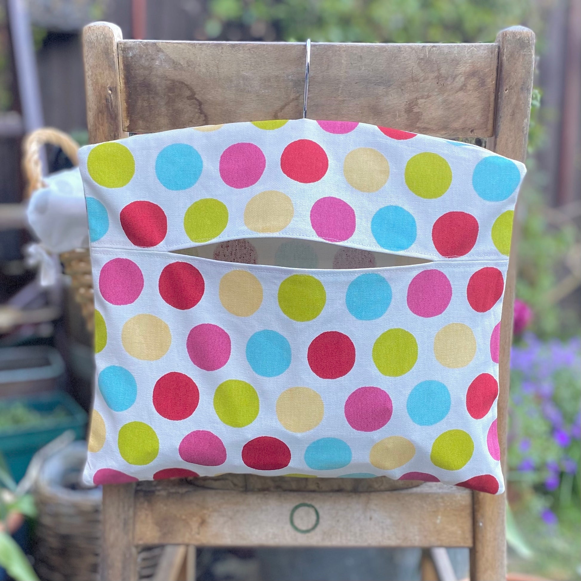 A cotton clothes peg bag with a large spot pattern in red, yellow, blue and green on a white background. Approximately 34cm wide and 28cm long with a wooden hanger in the top. Capacity is 75-100 wooden pegs.