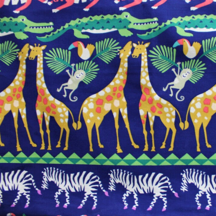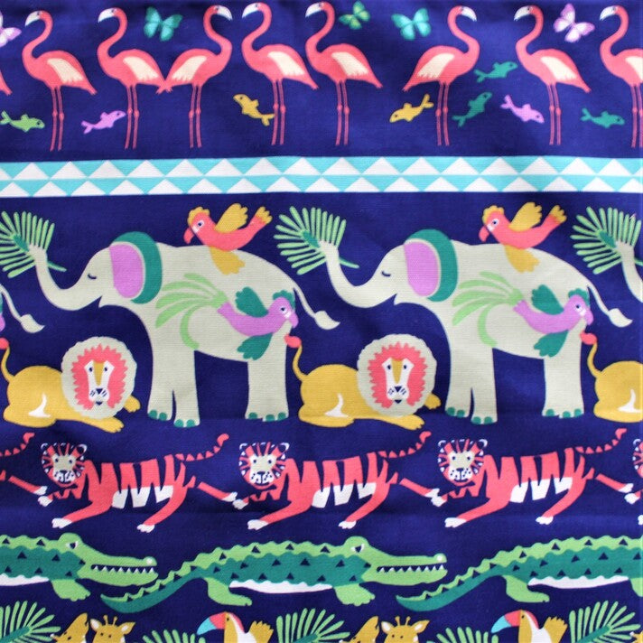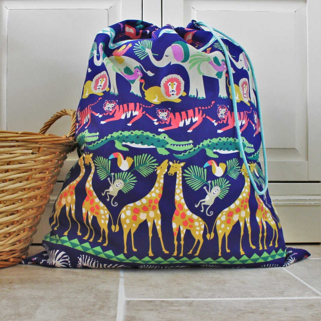 A brightly coloured cotton toy bag or laundry bag with a African animals on a dark blue background. The animals include giraffe, monkeys, zebra, tigers, crocodiles, elephants, lions and flamingos. The top of the toy bag has a drawstring. Approximately 58cm wide and 67cm long making it quite spacious for your toys or laundry.