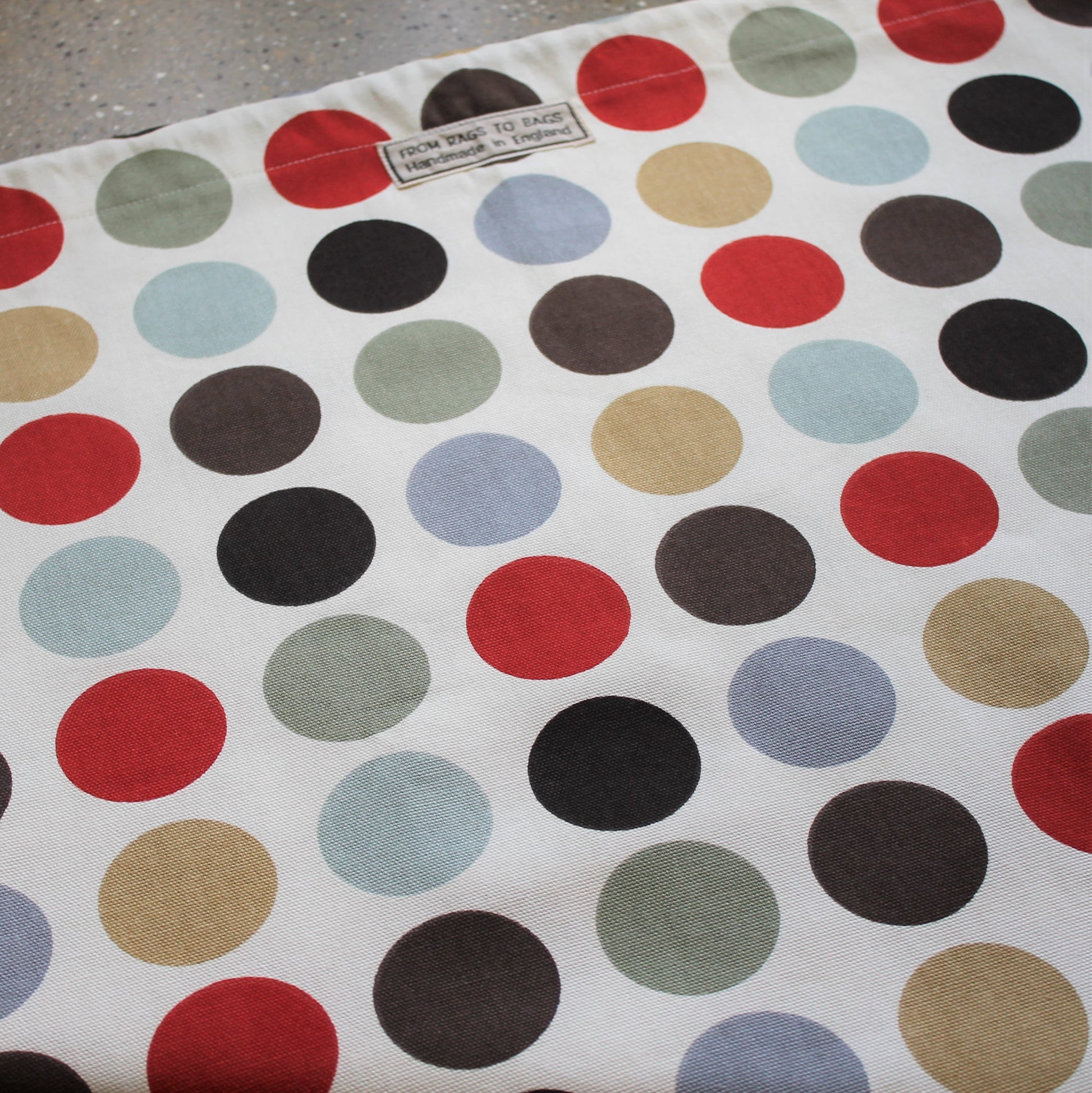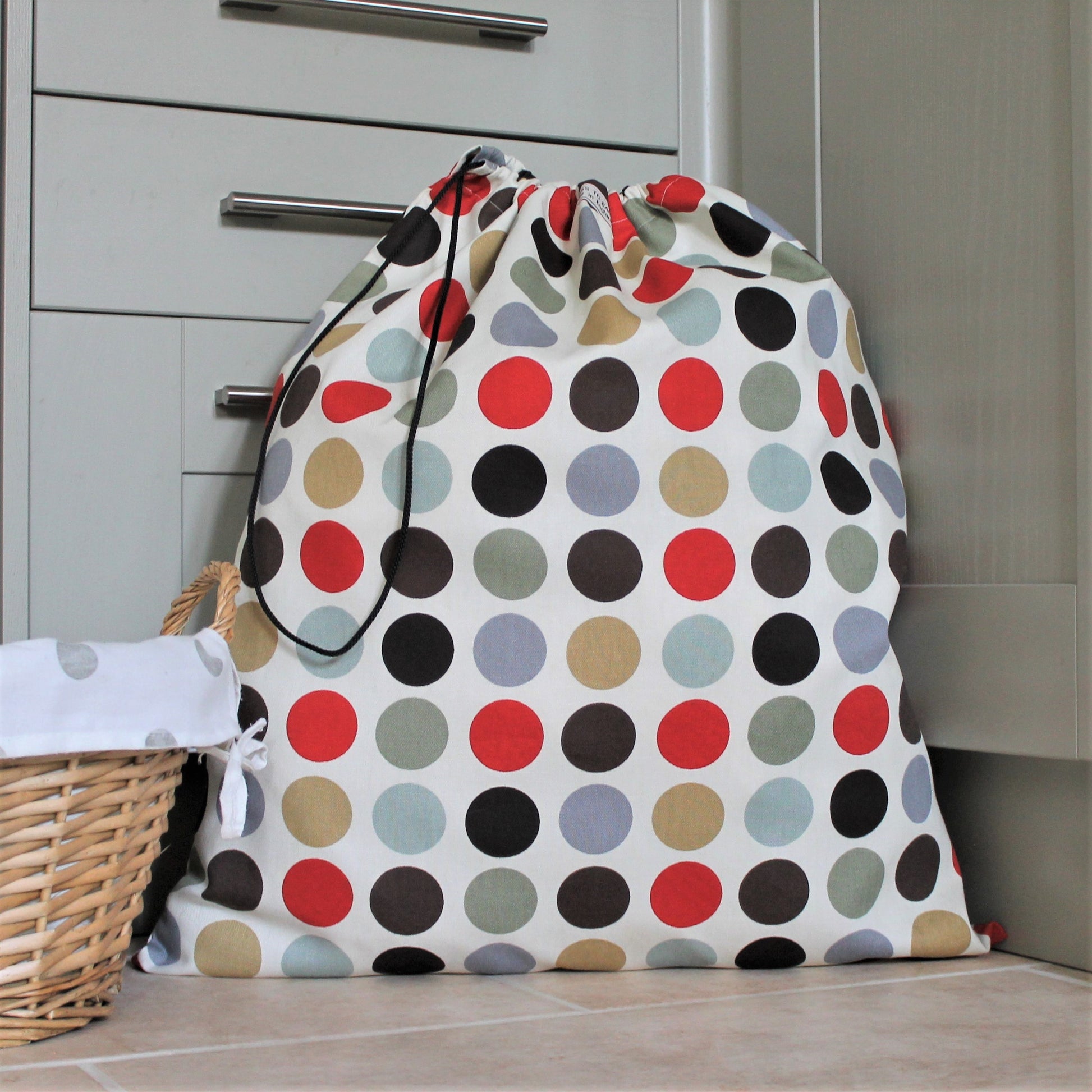 A spacious laundry bag with a red, brown and grey spot print on a cream background. The top of the laundry bag has a drawstring and the laundry bag measures approximately 58cm wide and 66cm long making it quite spacious for your laundry.