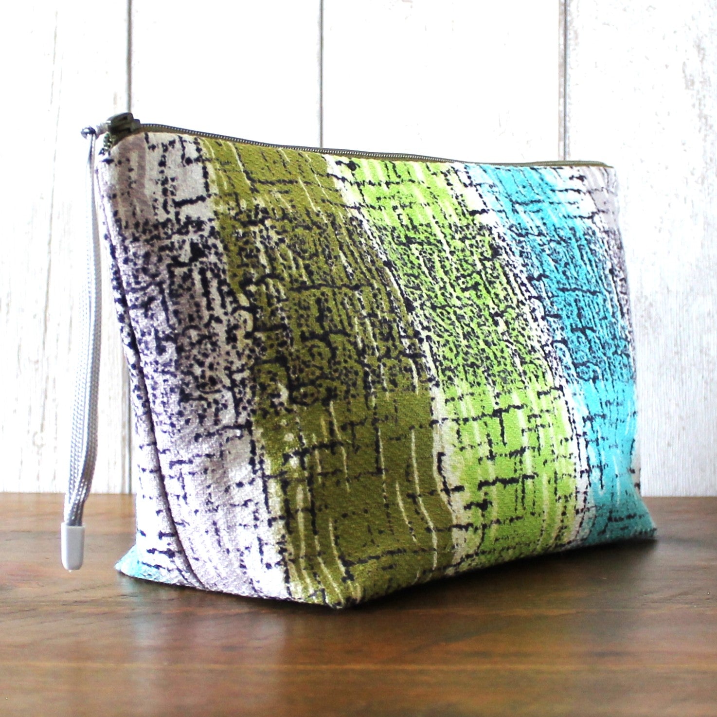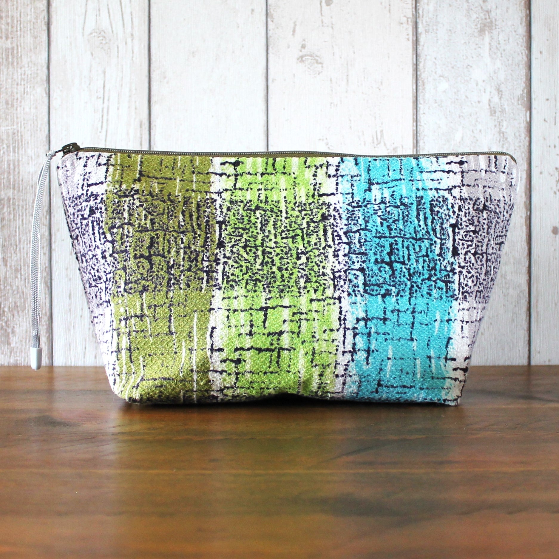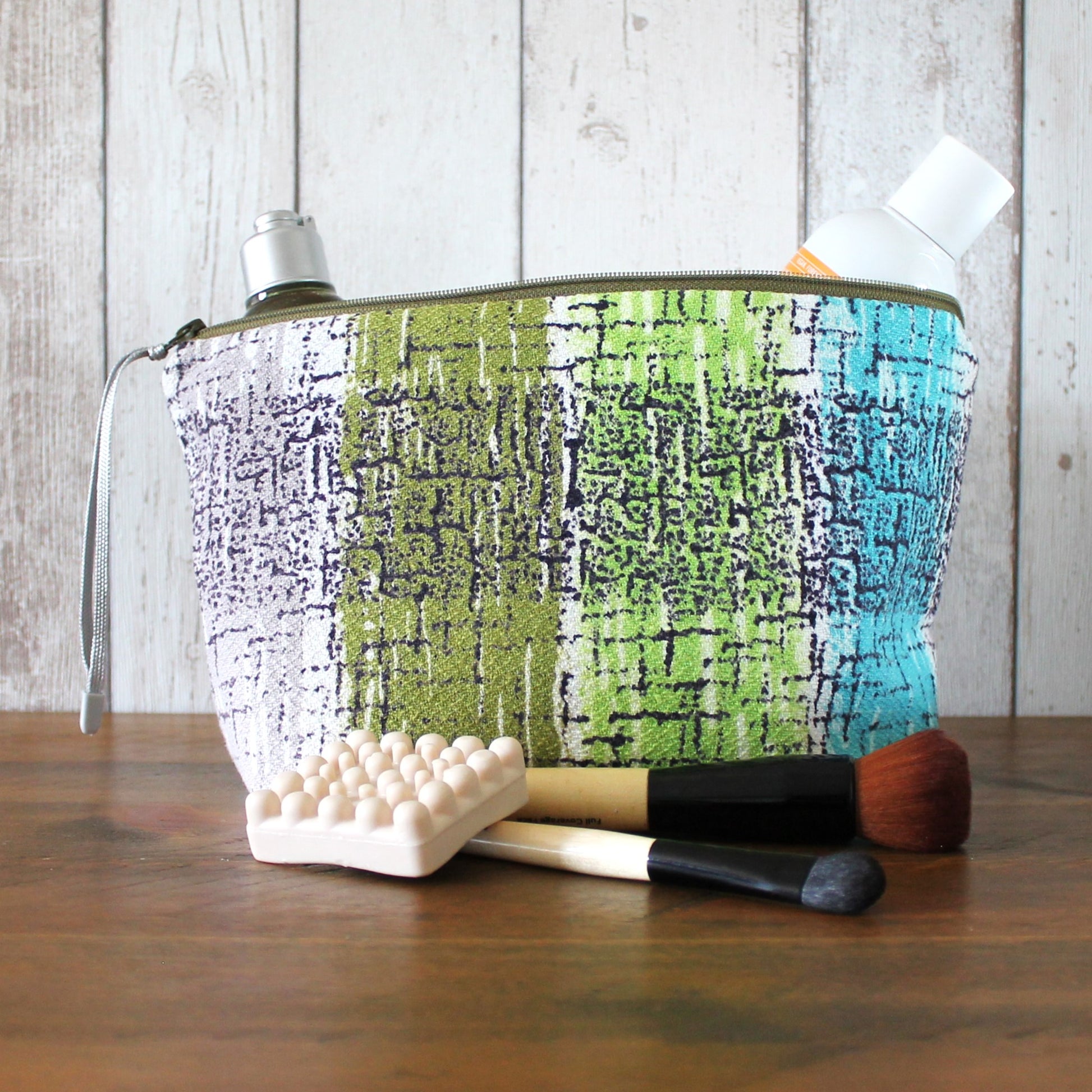 A barkcloth fabric makeup bag which is perfect for makeup or even gadgets. The outer fabric has is a vintage barkcloth cotton in stripes of green, grey and turquoise with a black over pattern.
