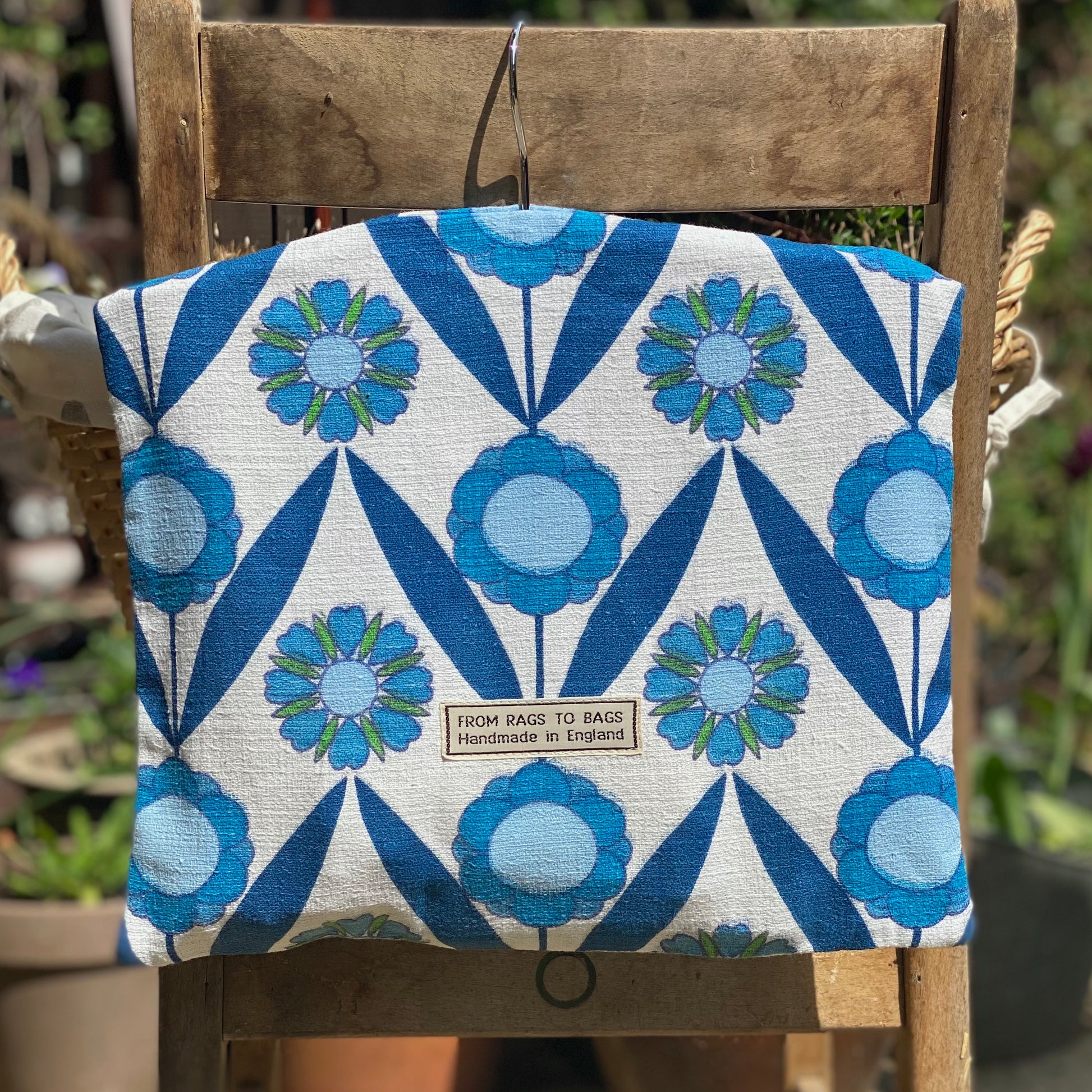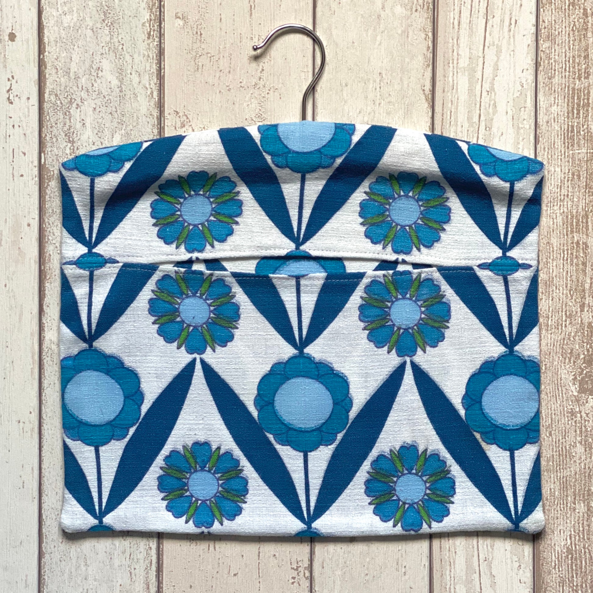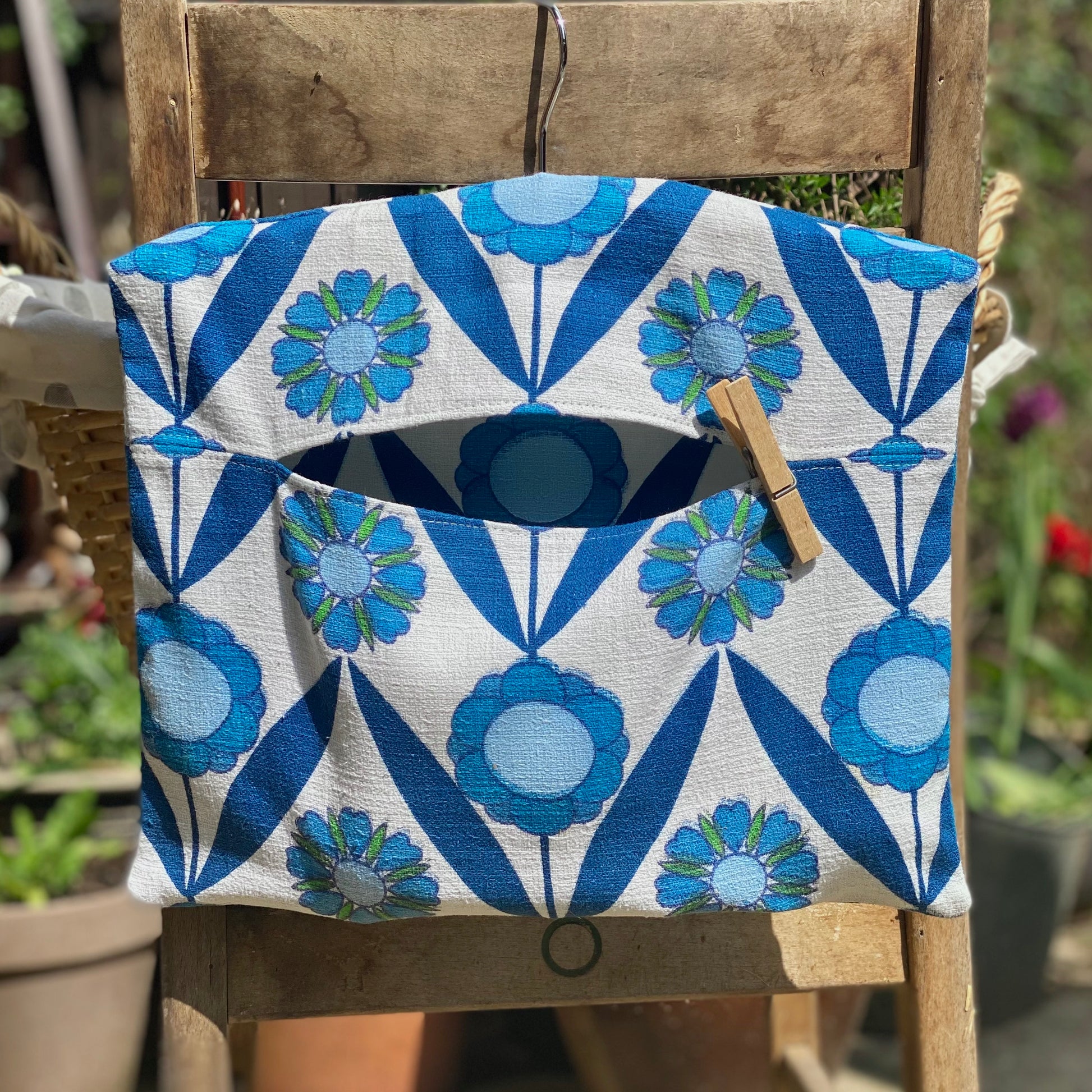 A vintage cotton fabric clothes peg bag with a bold blue floral design on a white background. Approximately 34cm wide and 28cm long with a wooden hanger in the top. Capacity is 75-100 wooden pegs.