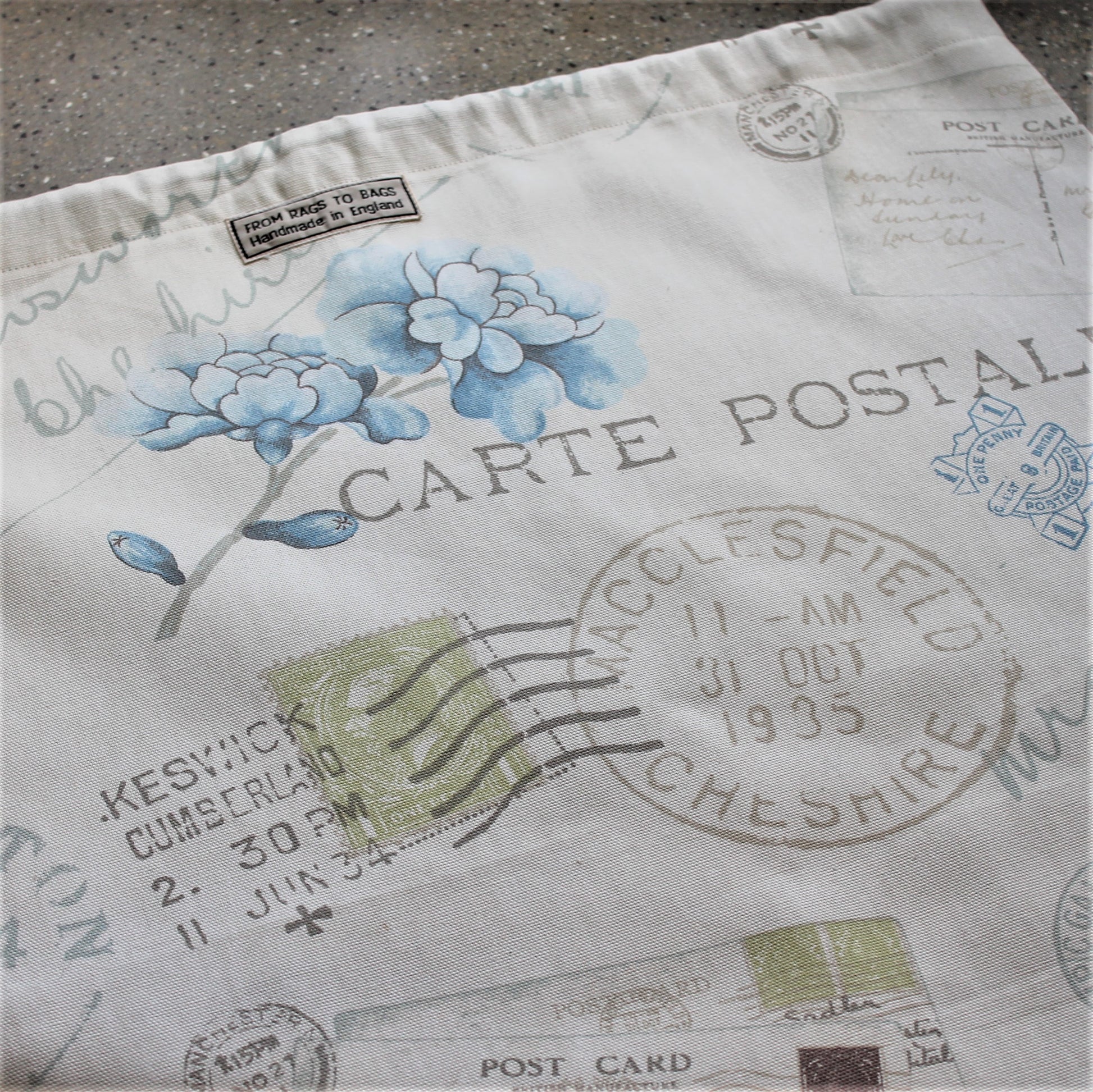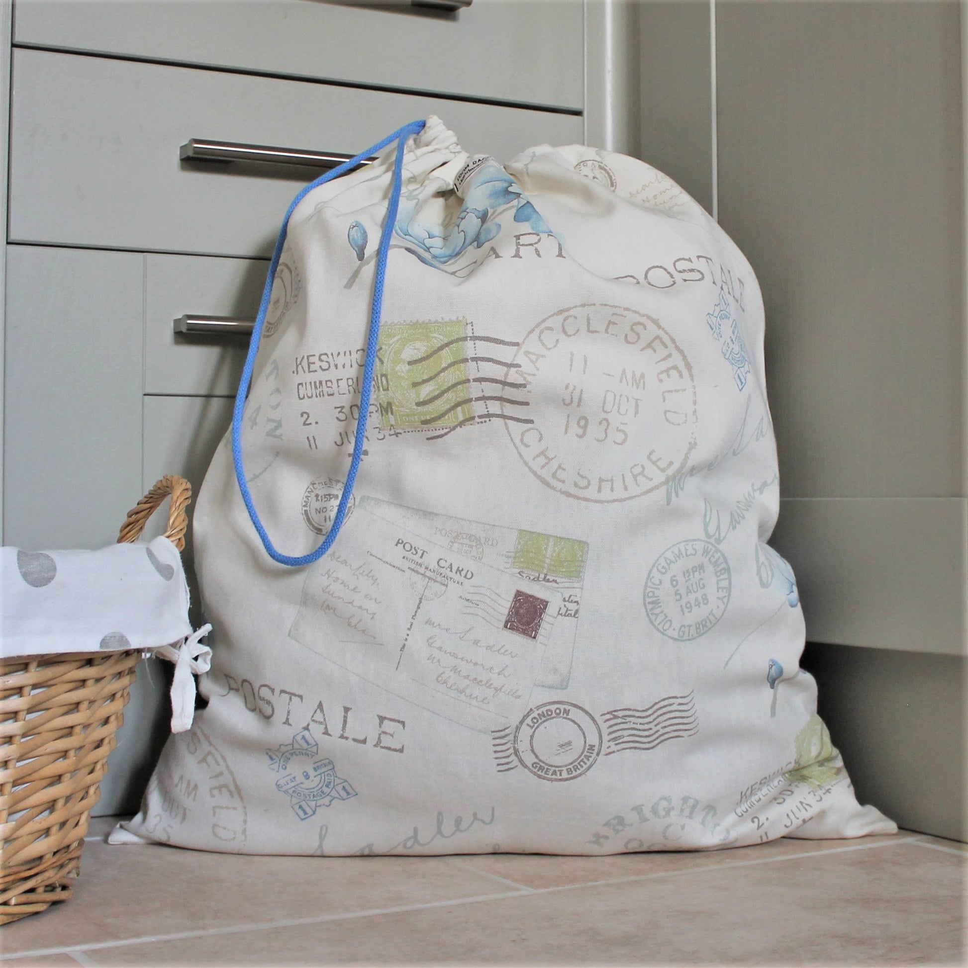 A large laundry bag with a blue, grey and green vintage postcard and flowers print on a cream background. The top of the laundry bag has a drawstring. Approximately 58cm wide and 68cm long making it quite spacious for your laundry.